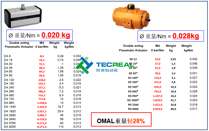 我們同樣先從兩者的雙動(dòng)型號(hào)開(kāi)始測(cè)試,OMAL氣動(dòng)執(zhí)行器 ? 重量/Nm = 0.020 kg,而埃爾蒂克? 重量/Nm = 0.028kg,OMAL比它輕28%。