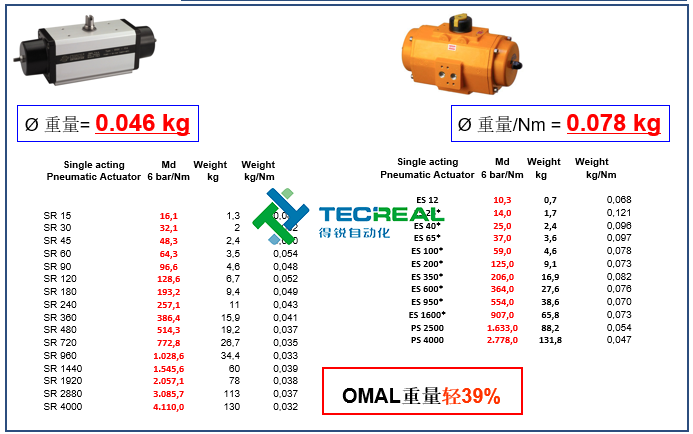 再看單動(dòng)型號(hào),OMAL氣動(dòng)執(zhí)行器 ? 重量/Nm = 0.046 kg,而埃爾蒂克? 重量/Nm = 0.078kg,OMAL比它輕39%。