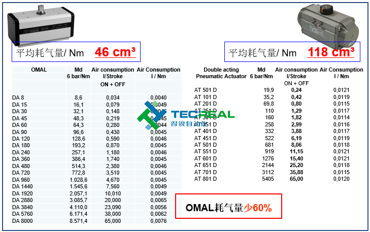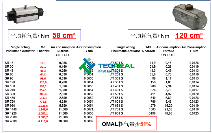再看單動型號的對比,OMAL的平均耗氣量/ Nm為58 cm3,Air Torque執行器平均耗氣量/ Nm為120 cm3,從圖中可以看出OMAL的耗氣量比對方少51%。
