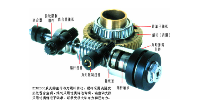 多級齒輪和蝸輪蝸桿傳動結構,蝸桿采用高強度熱處理合金鋼,渦輪采用優質鑄造青銅,輸出軸支撐采用優質錐滾子軸承,可承受極大軸向力和徑向力,傳動更加精確。