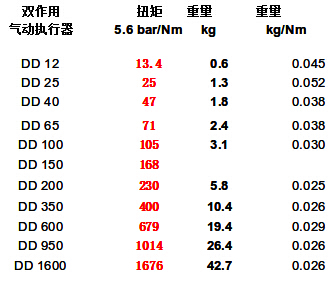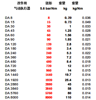 以雙作用氣動(dòng)執(zhí)行器為例(氣源壓力5.6bar時(shí)的數(shù)據(jù)表) OMAL(歐瑪爾) 能提供19個(gè)型號(hào),扭矩從8Nm~8000Nm的雙作用執(zhí)行器。扭矩范圍更廣,可選空間更大。執(zhí)行器的重量比BETTIS輕35%