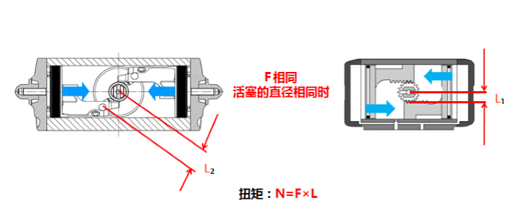 在執行器的開啟的過程,撥叉式執行器在軸轉動0°、45°、90°輸出的力矩成線性,分別是最大輸出力矩的100%、50%、100%,而齒輪齒條式執行器輸出力矩成直線,整個開啟過程都是一樣的,可見撥叉式氣動執行器運作時,輸出力扭能隨角度改變而改變,而且在閥門開啟或關閉位置,力矩值最大,這正好與閥門的規律相符。相比齒輪齒條式執行器,撥叉式氣動執行器和更能節省力矩,因為齒輪齒條式執行器的力矩是恒定。