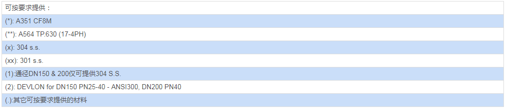 材料及等級:對ANSI 美標閥門,符合ASME B16.34 標準;對PN 公稱壓力閥門,符合EN12516 標準